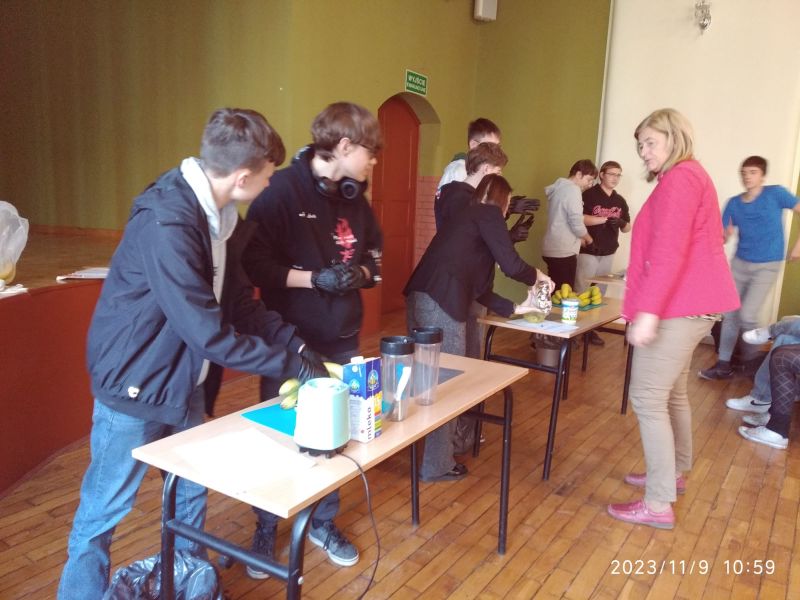 Po części teoretycznej młodzież przygotowała (zachowując higieniczne warunki) zdrowe i smaczne drugie śniadanie: napoje izotoniczne, koktajl energetyczny oraz płatki owsiane z jogurtem naturalnym, bananem i bakaliami. Degustowaliśmy i wszystko było pyszne! Widać to na zdjęciach. Polecamy!