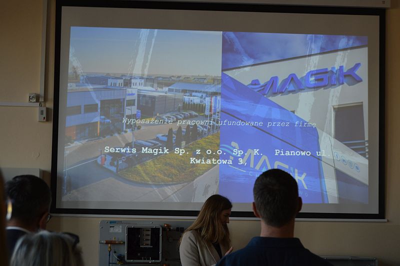 W drugiej części spotkania nastąpiło uroczyste otwarcie i prezentacja pracowni przedmiotowej dla chłodnictwa i klimatyzacji. Pracownia w pełni wyposażona została przez firmę Serwis Magik Sp. z o.o. Sp. K. W jej otwarciu wziął udział prezes firmy Serwis Magik, pan Piotr Domagała, na którego ręce Dyrektor ZS 18 pan Piotr Lusar złożył szczególne podziękowania. Przedstawiciele pracodawców zaproszeni zostali do pracowni, gdzie nauczycielka przedmiotów zawodowych, pani Weronika Racięcka, opowiedziała o tym, jak wyposażenie otrzymane przez szkołę wykorzystane zostanie w edukacji zawodowej.