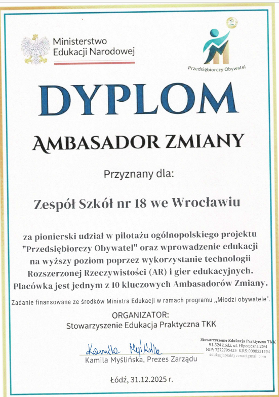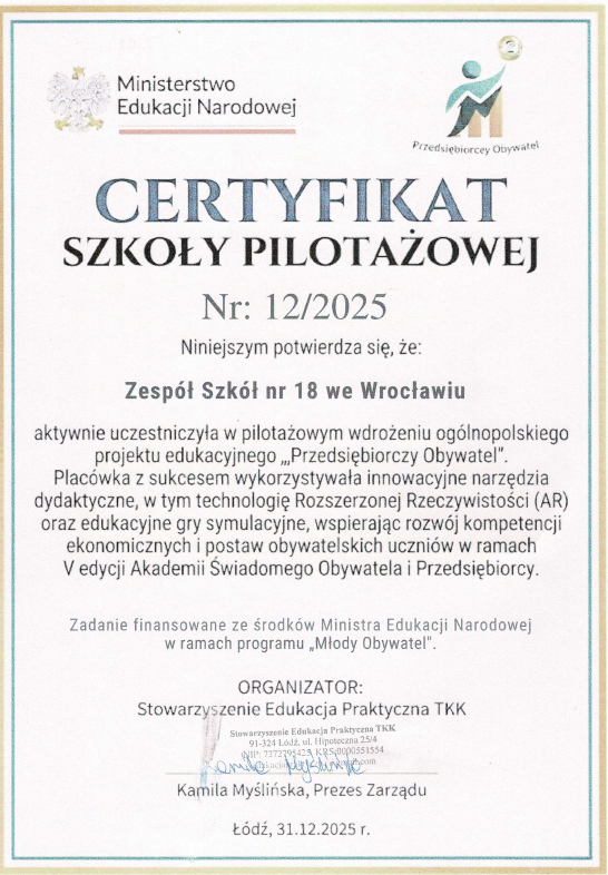 Nasza szkoła wzięła udział w pilotażowym wdrożeniu ogólnopolskiego projektu edukacyjnego „Przedsiębiorczy Obywatel”, pod patronatem Ministerstwa Edukacji Narodowej.