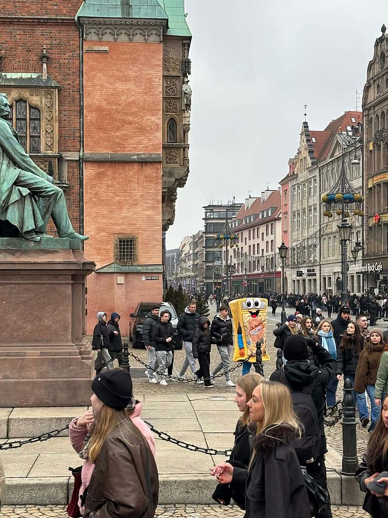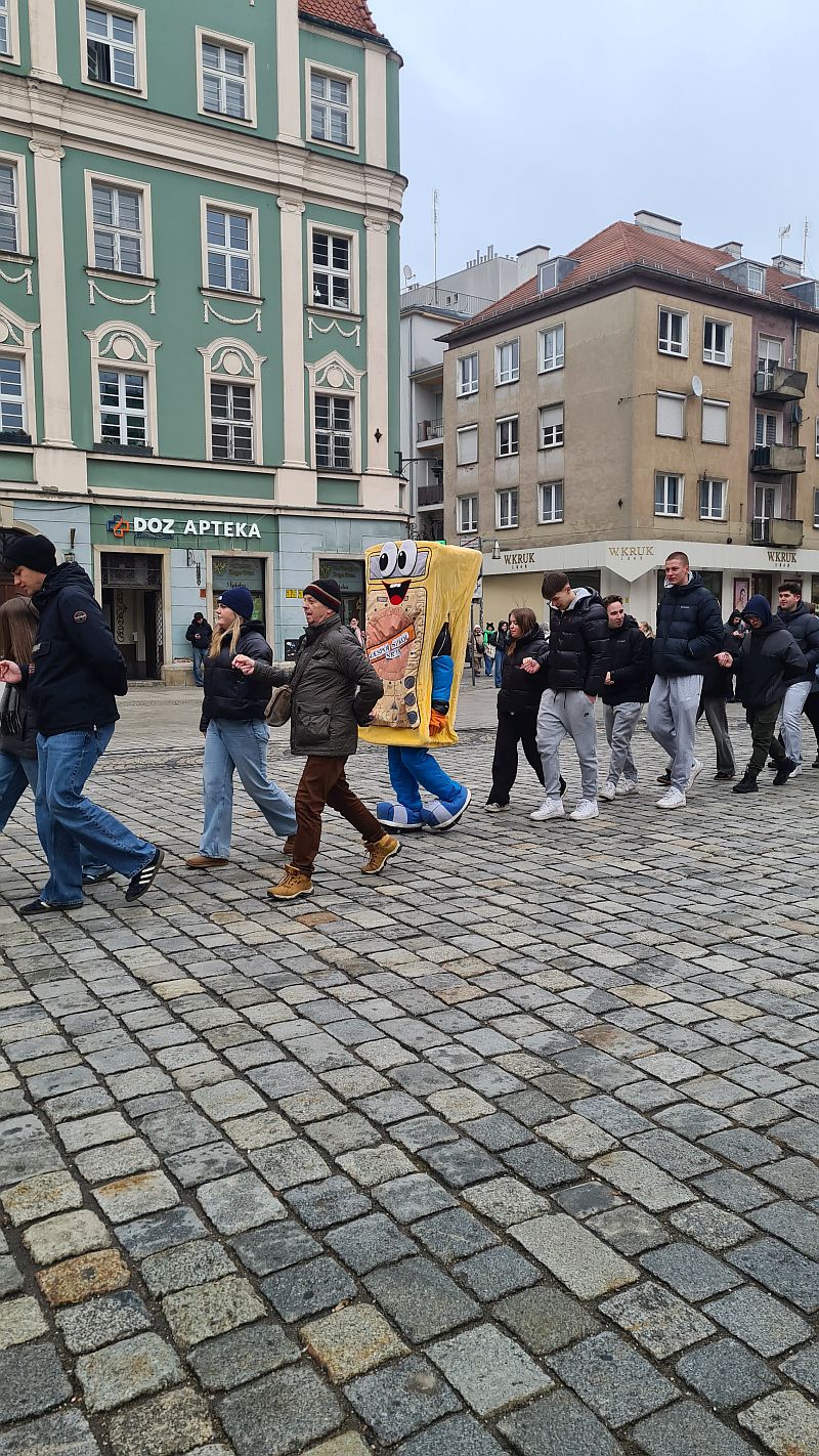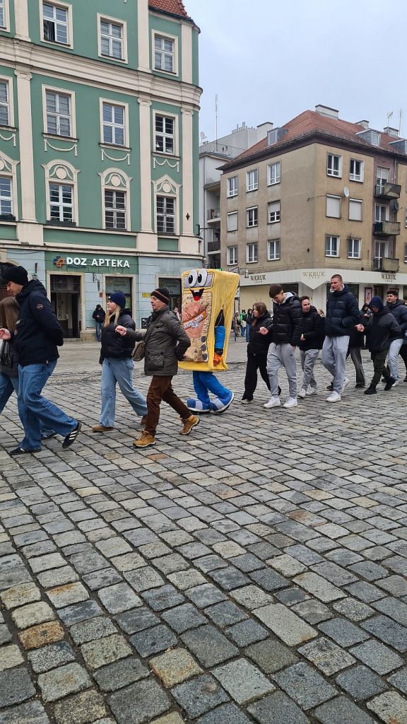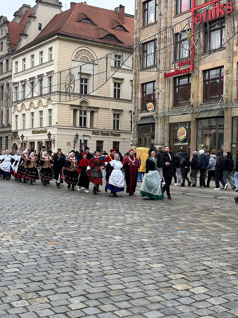 Wczoraj, 28 stycznia 2026 r., uczniowie klas maturalnych naszej szkoły wzięli udział w niezwykłym wydarzeniu na wrocławskim Rynku. Zgodnie z wieloletnią tradycją, punktualnie o godzinie 12:00, maturzyści z całego Wrocławia zgromadzili się pod pręgierzem, by wspólnie zatańczyć poloneza dla Fredry.