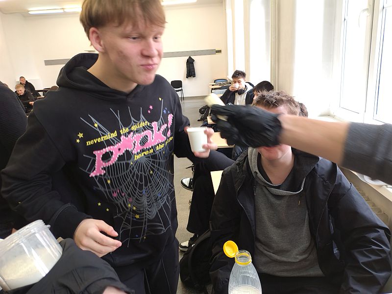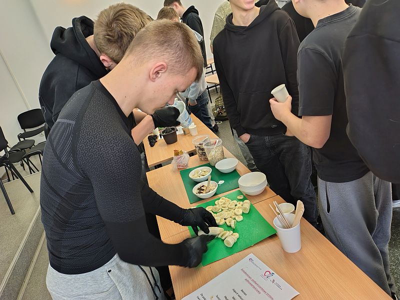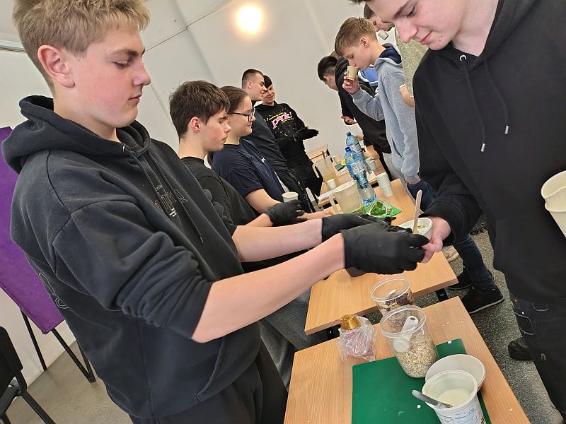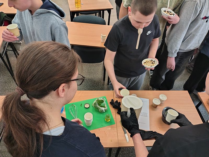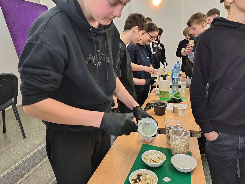 Młodzież wzięła udział zarówno w części teoretycznej, jak i praktycznej. A w praktycznej… było pysznie. Uczniowie przygotowali zdrowe napoje oraz płatki owsiane z jogurtem naturalnym, bananem i bakaliami. Niektórzy odkryli, że owsianka naprawdę może smakować, inni — że bakalie to nie są „suszone rodzynki z babcinego ciasta”, tylko całkiem fajny dodatek.